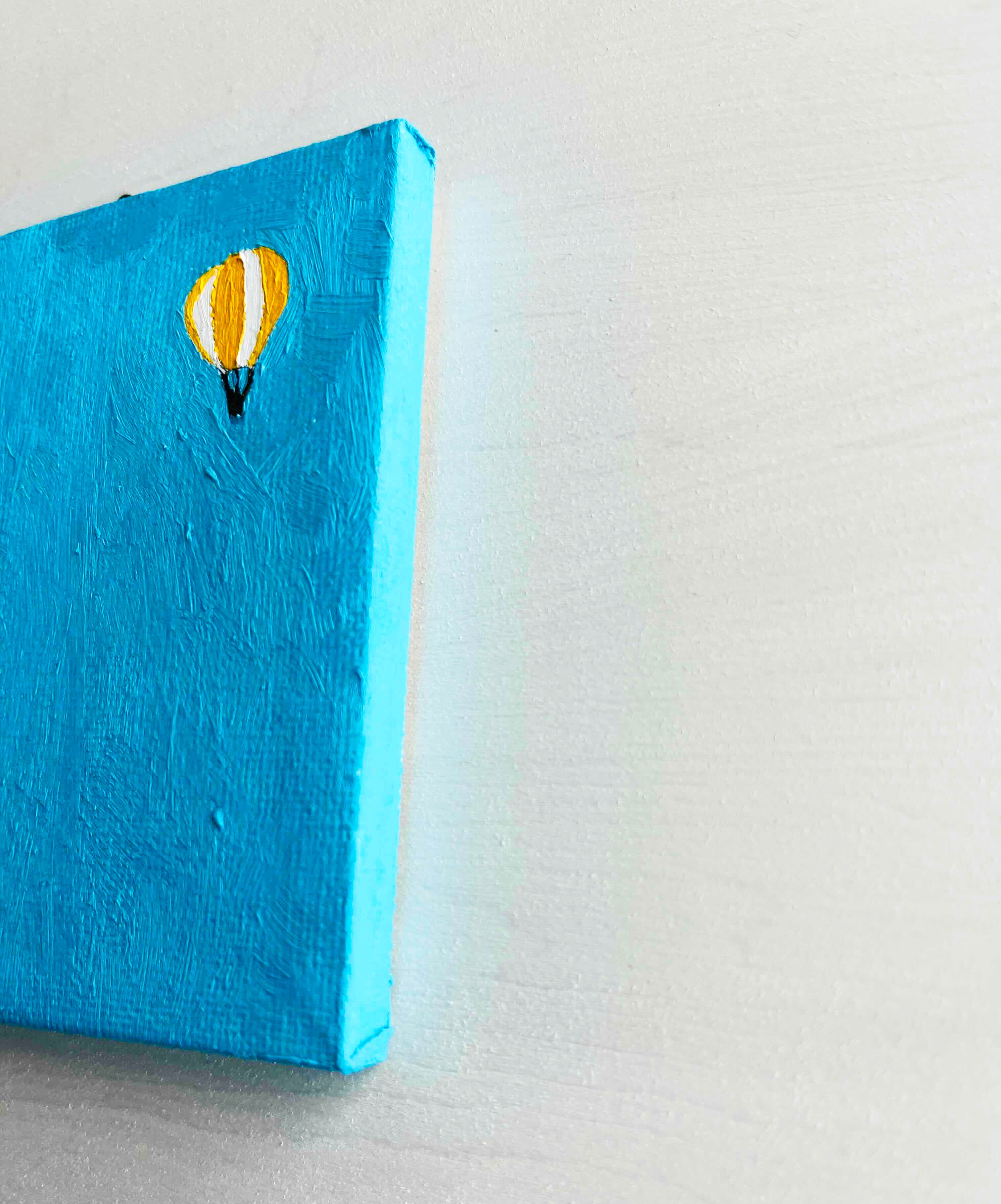 「青空に黄色と白のストライプ気球」原画・油彩・壁掛け・10㎝角